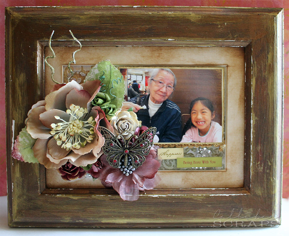 Flowers, glass pebbles, roman numeral metal and chevron mask from Prima Marketing