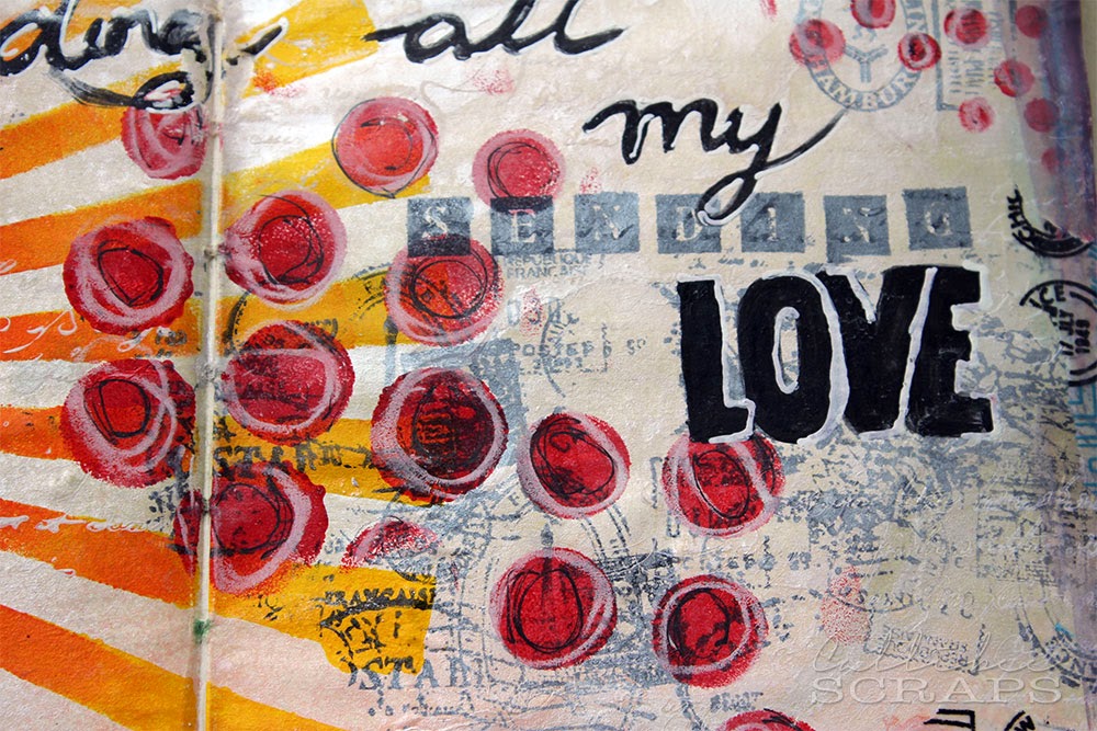 I sprayed the raw canvas with some muted pinks and blue, drying it, before adding the molding paste over a mask. After that, I edged it with distress ink and also used a pattern stamp randomly around the page.